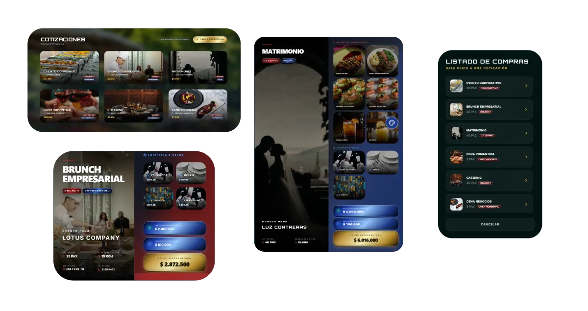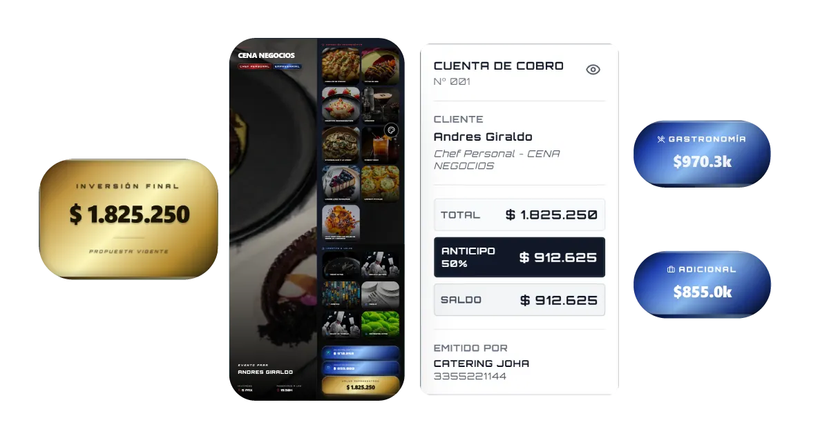 Profesionaliza tu proceso de ventas. Genera propuestas estéticas e interactivas sin límites, detallando platos, logística del evento, notas de alérgenos y valores del servicio en un formato que proyecta la excelencia de tu trabajo.