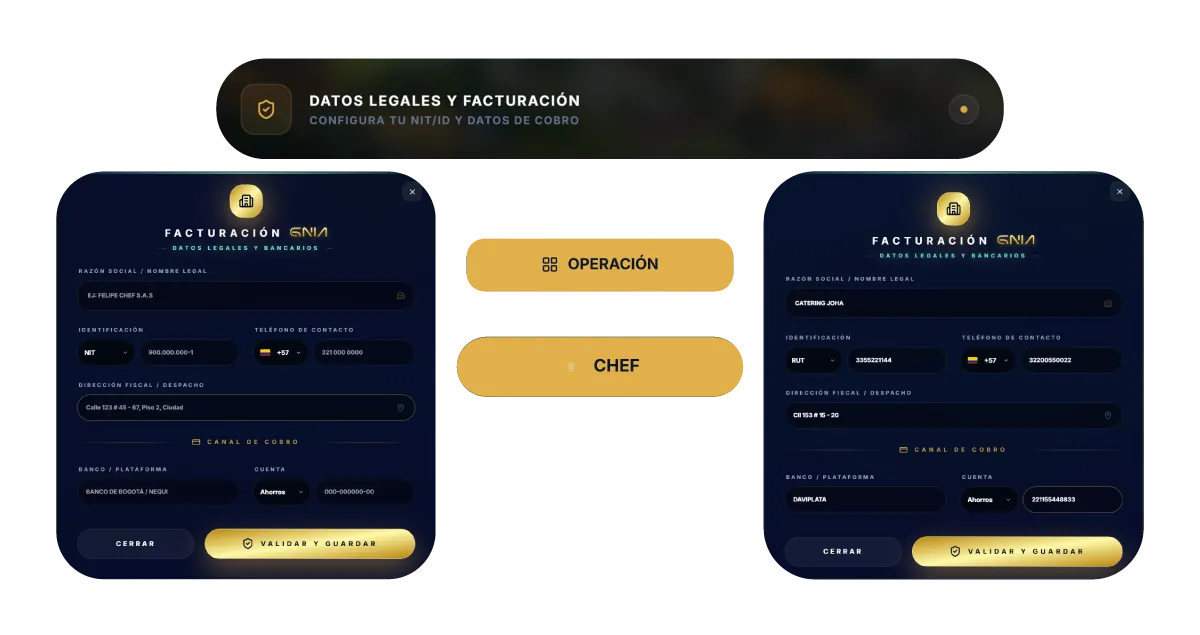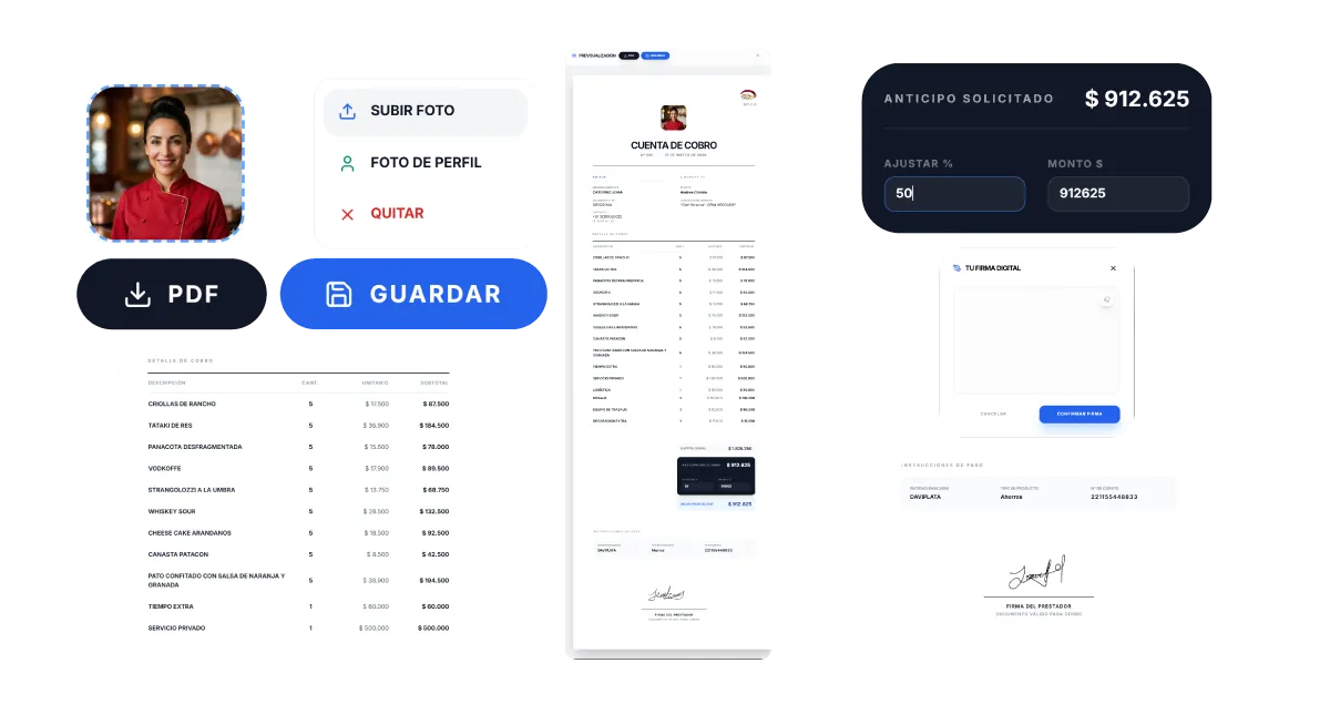 Legaliza tus servicios como Chef Independiente y entrega documentos válidos para que puedas recibir tus pagos con total confianza. Agrega tus datos personales y bancarios, el porcentaje del anticipo para empezar la operación y añade tu firma digital al finalizar. Cada cotización que realices tendrá su respectiva cuenta de cobro, para que puedas llevar el registro.