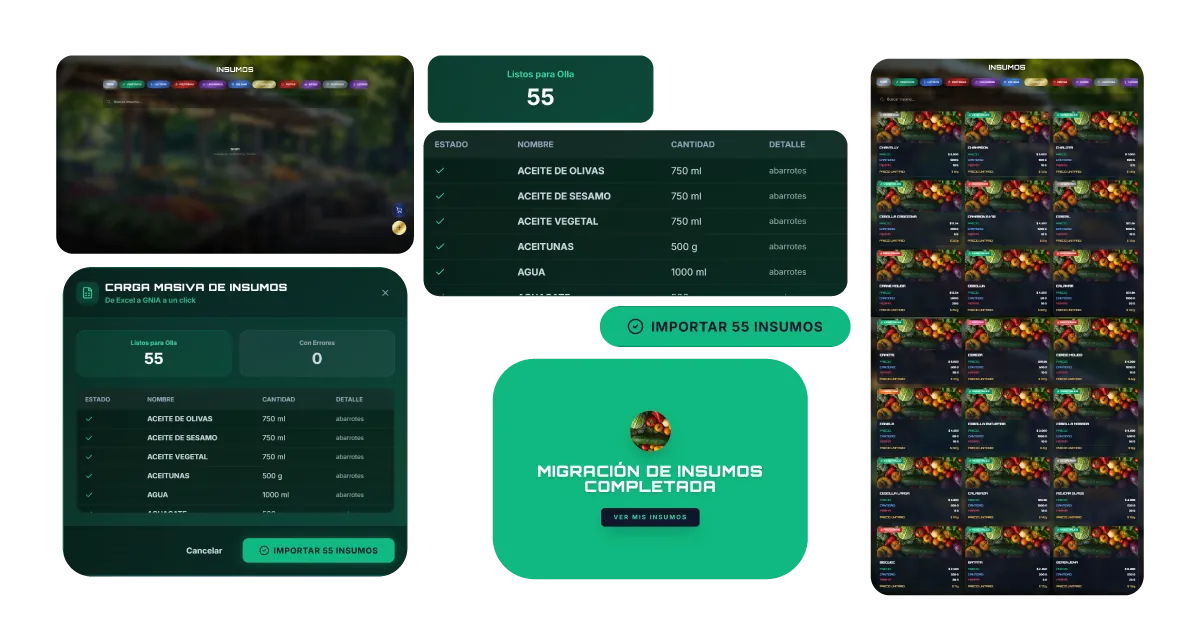 Ahorra horas de trabajo administrativo. Sube toda tu base de datos de insumos de forma masiva mediante nuestra plantilla inteligente; el sistema se encargará de crear cada registro automáticamente para que empieces a operar en cuestión de minutos.