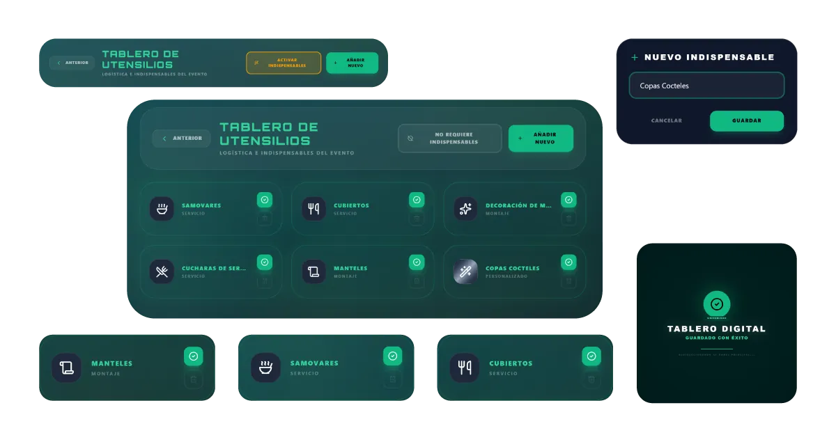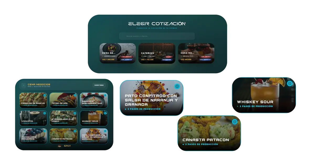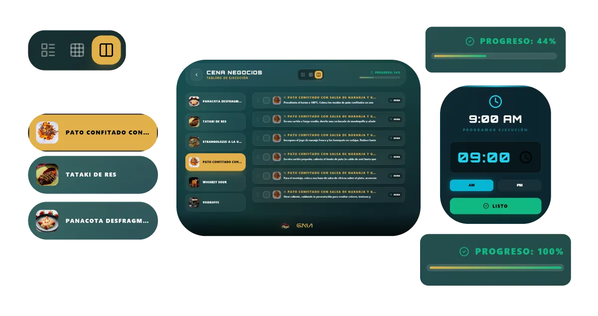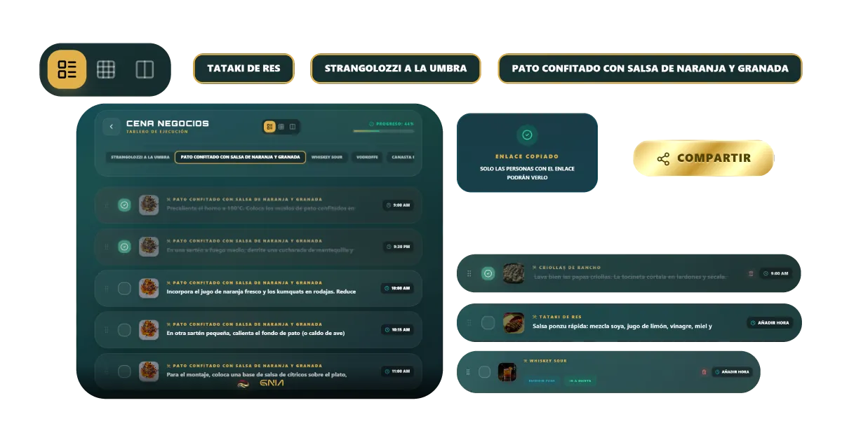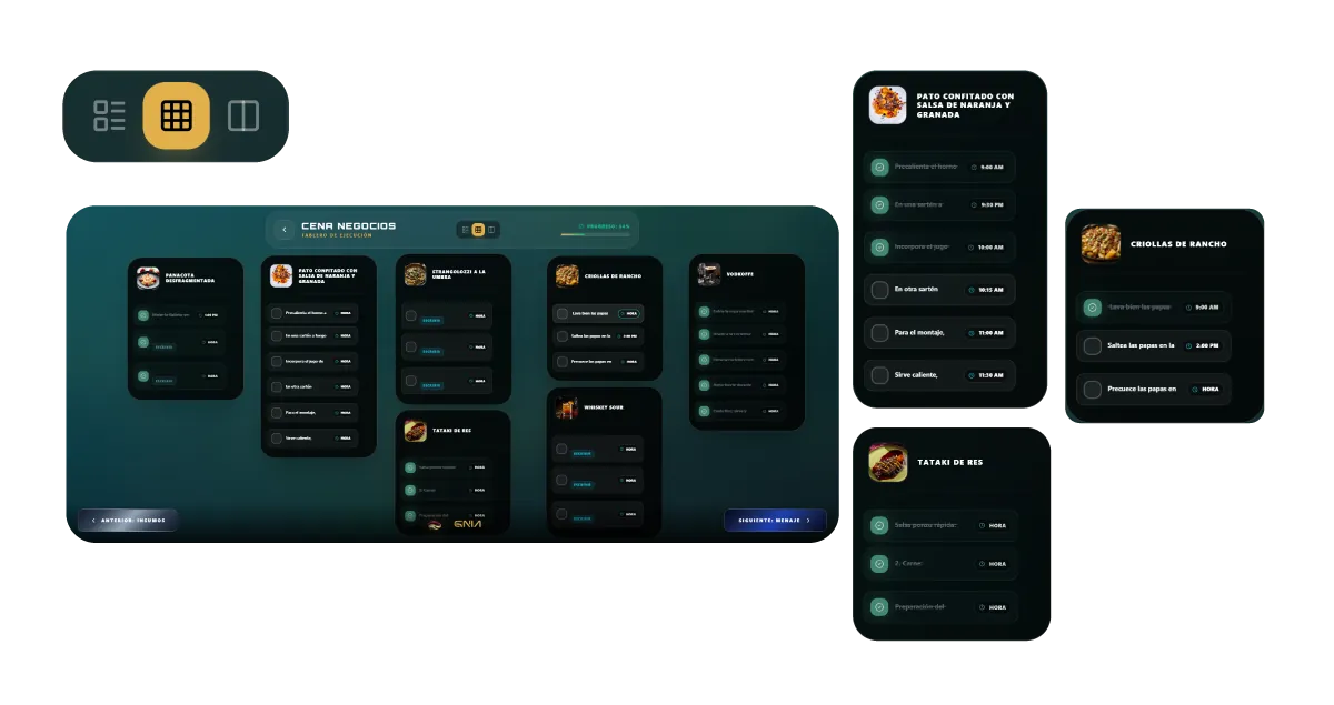 Organiza toda la preparación de tu evento en un tablero totalmente digital. Allí podrás seleccionar el servicio que vas a trabajar, visualizar los platos escogidos y la cantidad de insumos necesarios. Cuenta con 3 diferentes vistas (Lista/Pulpo/Dividida) para llevar el orden del paso a paso de tus preparaciones, programar la hora de cada proceso y tener acceso a un tablero de utensilios para que no te haga falta nada en el servicio.